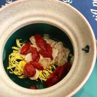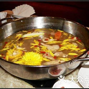 制法:菊花火鍋是蘇杭一帶的名饌藥膳,它將鮮菊花瓣浸入溫水中漂洗,撈起放入竹籃里濾凈,暖鍋里盛著原汁雞湯,將魚(yú)片或肉片投入鍋時(shí),須抓一些菊花投入鍋中,魚(yú)片雞湯加上菊花“三合一”清香和鮮美。